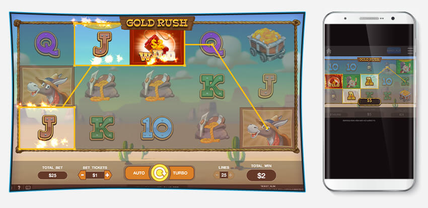 Gold Rush features an exciting Free Spins Round which is triggered when a player hits 3, 4 or 5 Free Spin icons giving them 5,10 or 15 Free Spins. They will head into the goldmine where the old miner will drop multiple random wild icons (up to 9 per spin) for some explosive wins! Free spins can retrigger indefinitely!